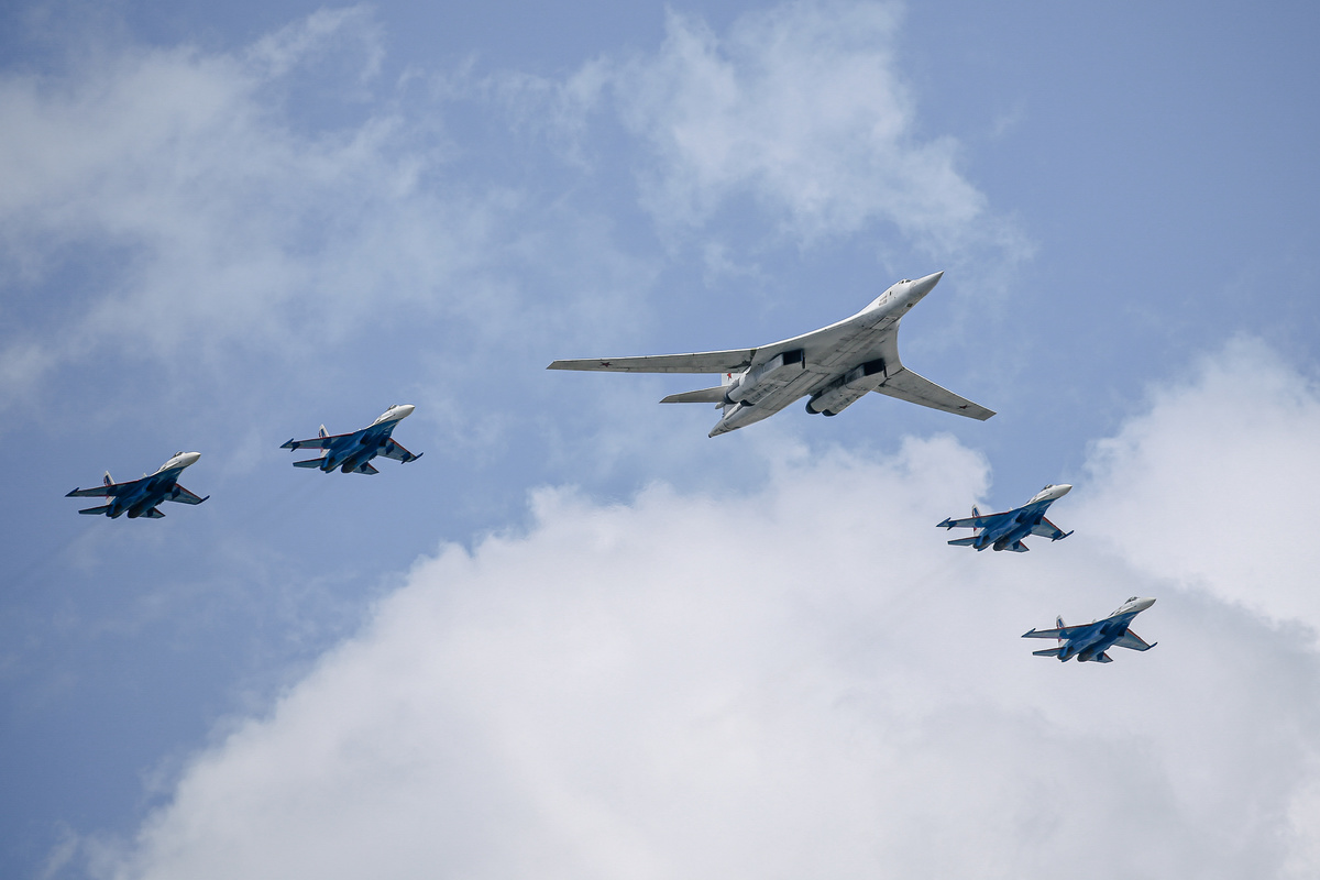 2021年5月7日,参加胜利日阅兵彩排的图-160战略轰炸机和苏-35S战斗机飞过俄罗斯莫斯科红场。(新华社发,叶甫盖尼·西尼岑摄)