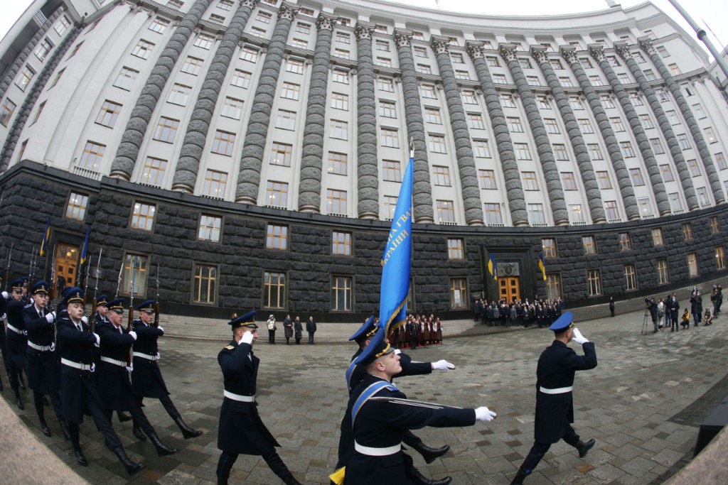 2月16日,在乌克兰首都基辅,乌国民卫队仪仗队行进至乌克兰政府办公大楼。(新华社发,谢尔盖·斯塔拉斯坚科摄)