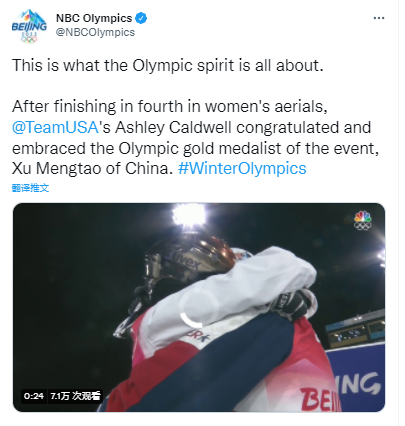 中美运动员的暖心互动也感动了外国媒体和网友。美国全国广播公司转发视频指出,“这就是奥林匹克精神的全部意义所在”。加拿大广播公司认为,这是“友谊第一”的体现。一位美国网友留言称,“这是迄今为止我看到关于奥运会意义最棒的诠释。太美好了。”还有一位加拿大网友点赞表示,“能够欣赏竞争对手的表现,彼此祝贺,两位的表现都很优秀。”