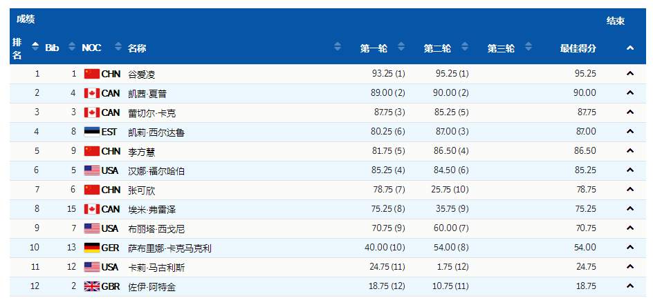 自由式滑雪女子U型场地技巧决赛第二轮,最后一个出场的中国队选手谷爱凌获得95.25分,继续领跑。