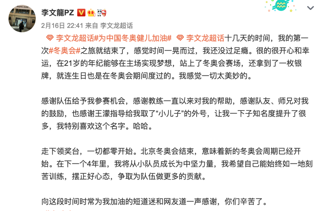 2月16日晚,短道速滑项目收官之夜,李文龙在微博写道:“十几天的时间,我的第一次冬奥会之旅就结束了,感觉时间一晃而过,我还没过足瘾。真的很开心和幸运,在21岁的年纪能够在主场实现梦想,站上了冬奥会赛场,还拿到了一枚银牌,就连生日也是在冬奥会期间度过的。我感觉一切太美妙。”