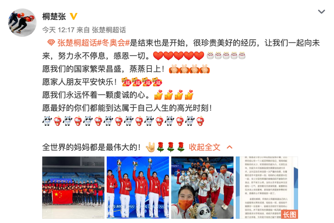 张楚桐表示,冬奥之旅是结束也是开始,很珍贵美好的经历。她写道:“让我们一起向未来,努力永不停息,感恩一切。”