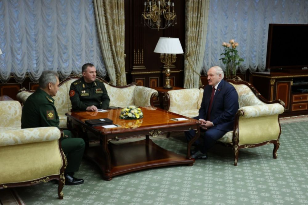 2月3日,白俄罗斯总统卢卡申科(右一)在明斯克会见到访的俄罗斯国防部长绍伊古(左一)。(新华社发,白俄罗斯总统网站供图)