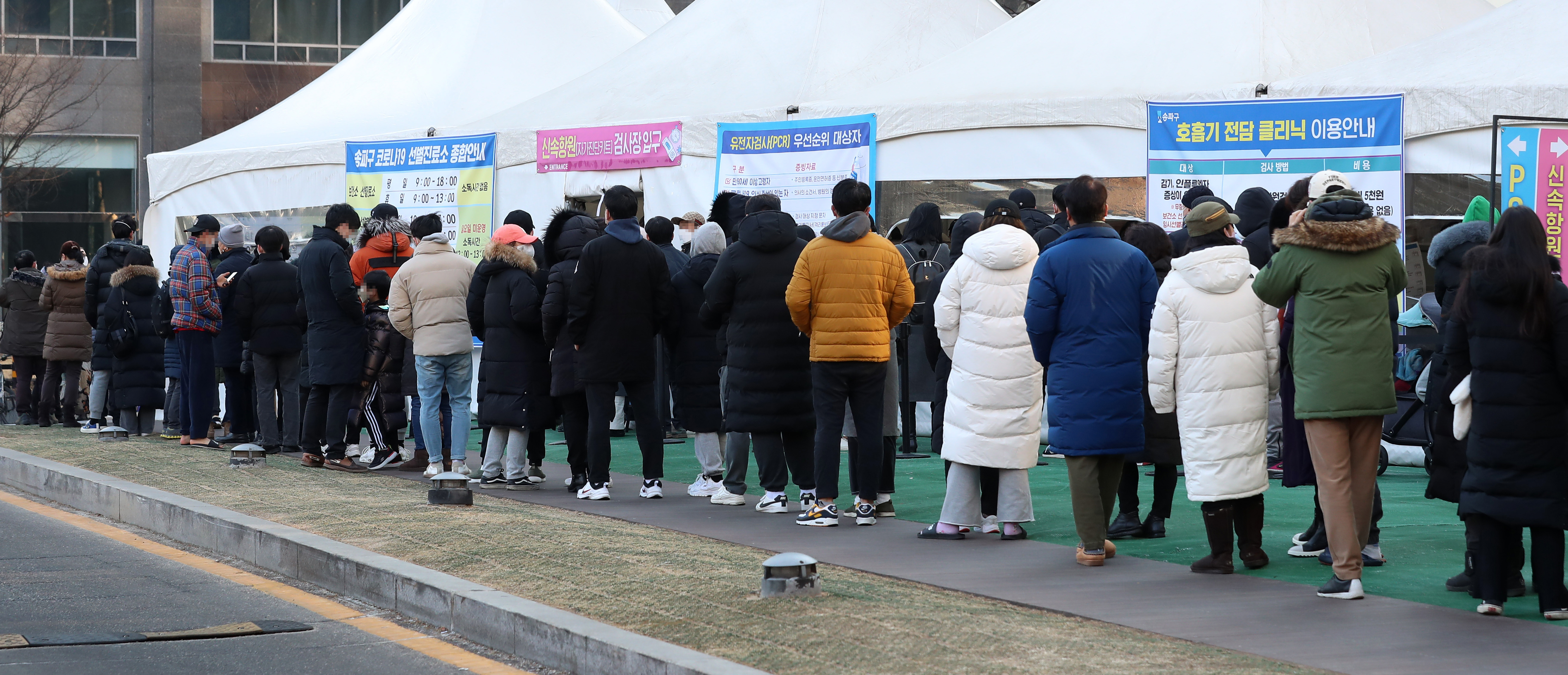 新华社照片,首尔,2022年2月18日 (国际疫情)(5)韩国日增新冠确诊病例超10万例 2月18日,人们在韩国首尔一处新冠病毒检测点排队等待检测。 韩国中央防疫对策本部18日通报,截至18日零时,韩国过去24小时新增新冠确诊病例109831例,累计确诊超175万例。 新华社/纽西斯通讯社