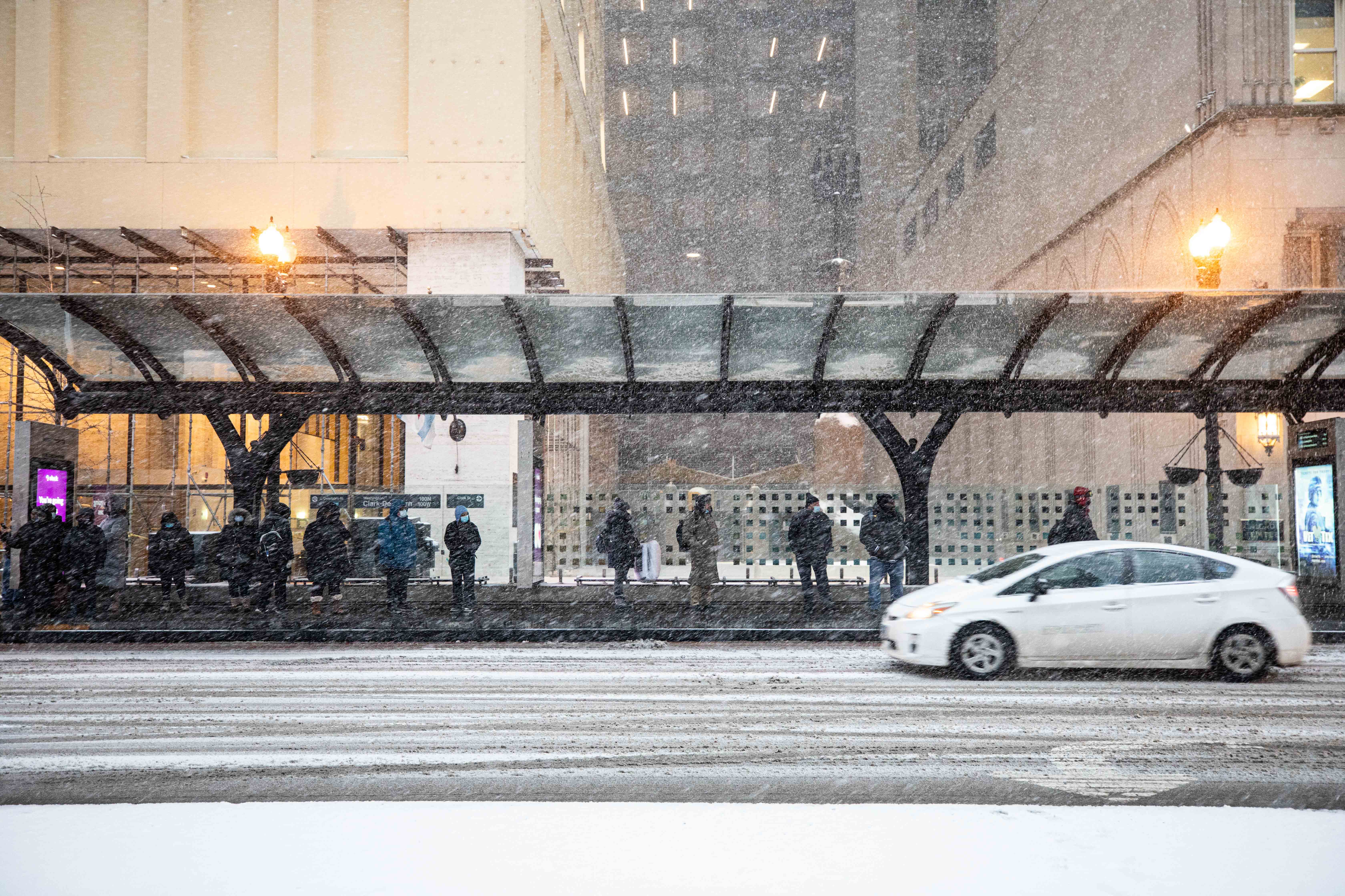新华社照片,芝加哥,2022年2月18日 (国际)(4)冬季风暴袭击芝加哥 2月17日,人们在美国芝加哥等待公交车。 当日,一场冬季风暴袭击了美国中部地区。 新华社发(文森特·约翰逊摄)