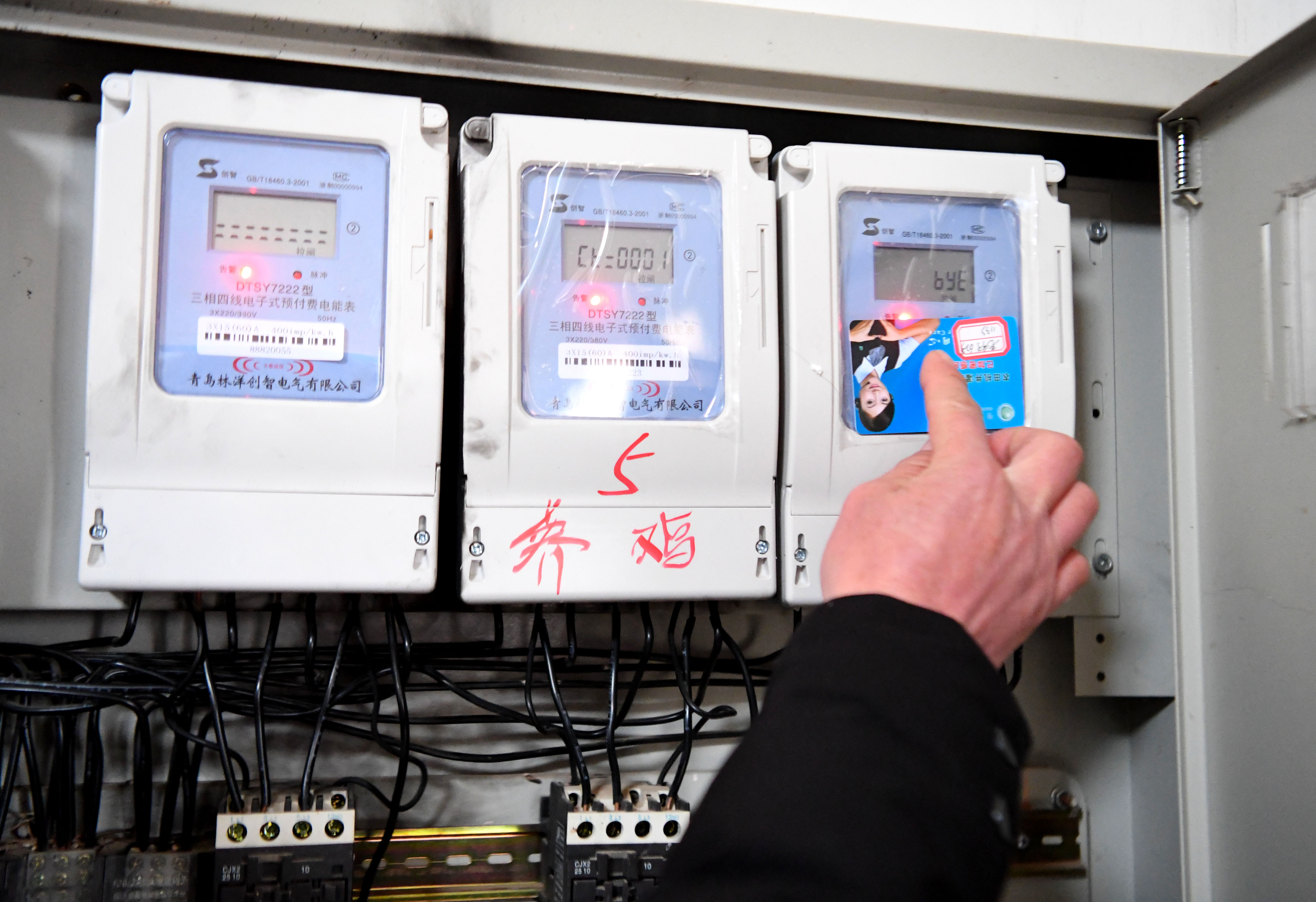 2月16日,在河南省新乡市封丘县李庄镇竹岗村,村民在配电房刷卡取电。(新华社记者郝源 摄)