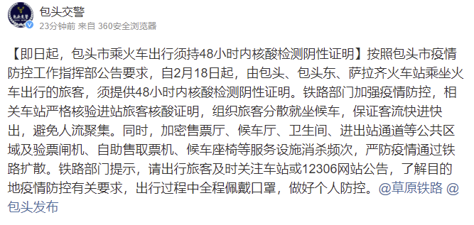 @包头交警 微博消息,按照包头市疫情防控工作指挥部公告要求,自2月18日起,由包头、包头东、萨拉齐火车站乘坐火车出行的旅客,须提供48小时内核酸检测阴性证明。铁路部门加强疫情防控,相关车站严格核验进站旅客核酸证明,组织旅客分散就坐候车,保证客流快进快出,避免人流聚集。同时,加密售票厅、候车厅、卫生间、进出站通道等公共区域及验票闸机、自助售取票机、候车座椅等服务设施消杀频次,严防疫情通过铁路扩散。铁路部门提示,请出行旅客及时关注车站或12306网站公告,了解目的地疫情防控有关要求,出行过程中全程佩戴口罩,做好个人防控。