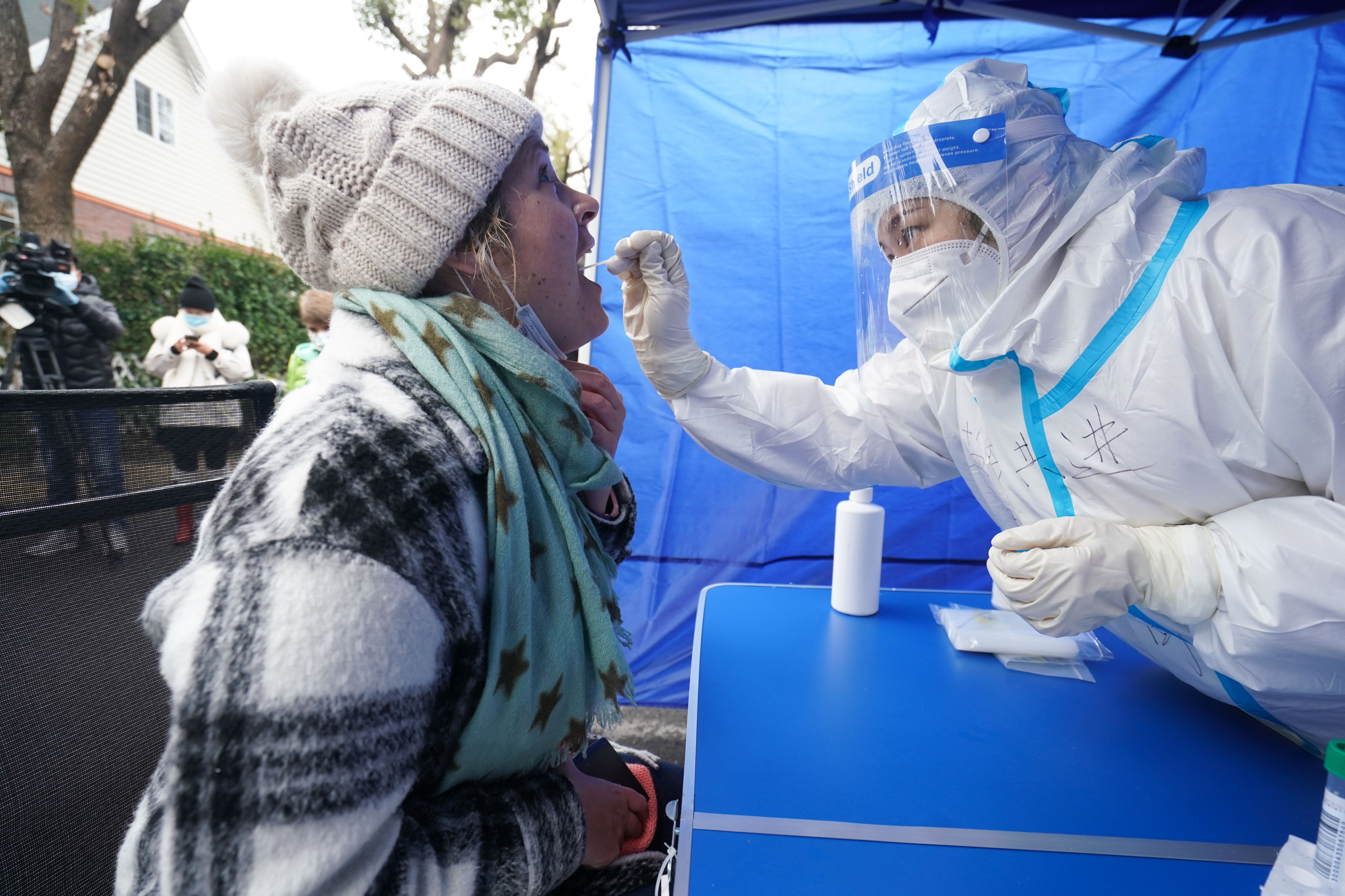 新华社照片,苏州(江苏),2022年2月18日 中外志愿者苏州“疫”线忙 2月18日,在苏州工业园区西湖社区青湖丽苑小区核酸采样点,一名外籍人士在接受核酸采样。 当日,苏州工业园区开展第三轮区域核酸检测。西湖社区青湖丽苑小区居住着不少来自美国、德国、日本等国家的外籍人士,为让他们能够顺利完成核酸采样,苏州工业园区融荟文化交流中心国际志愿者团队的王君和来自美国的施爱伦、丁唐三名志愿者,与社区招募的外语志愿者等在核酸检测现场提供服务,通力协作防控疫情。 新华社记者 季春鹏 摄