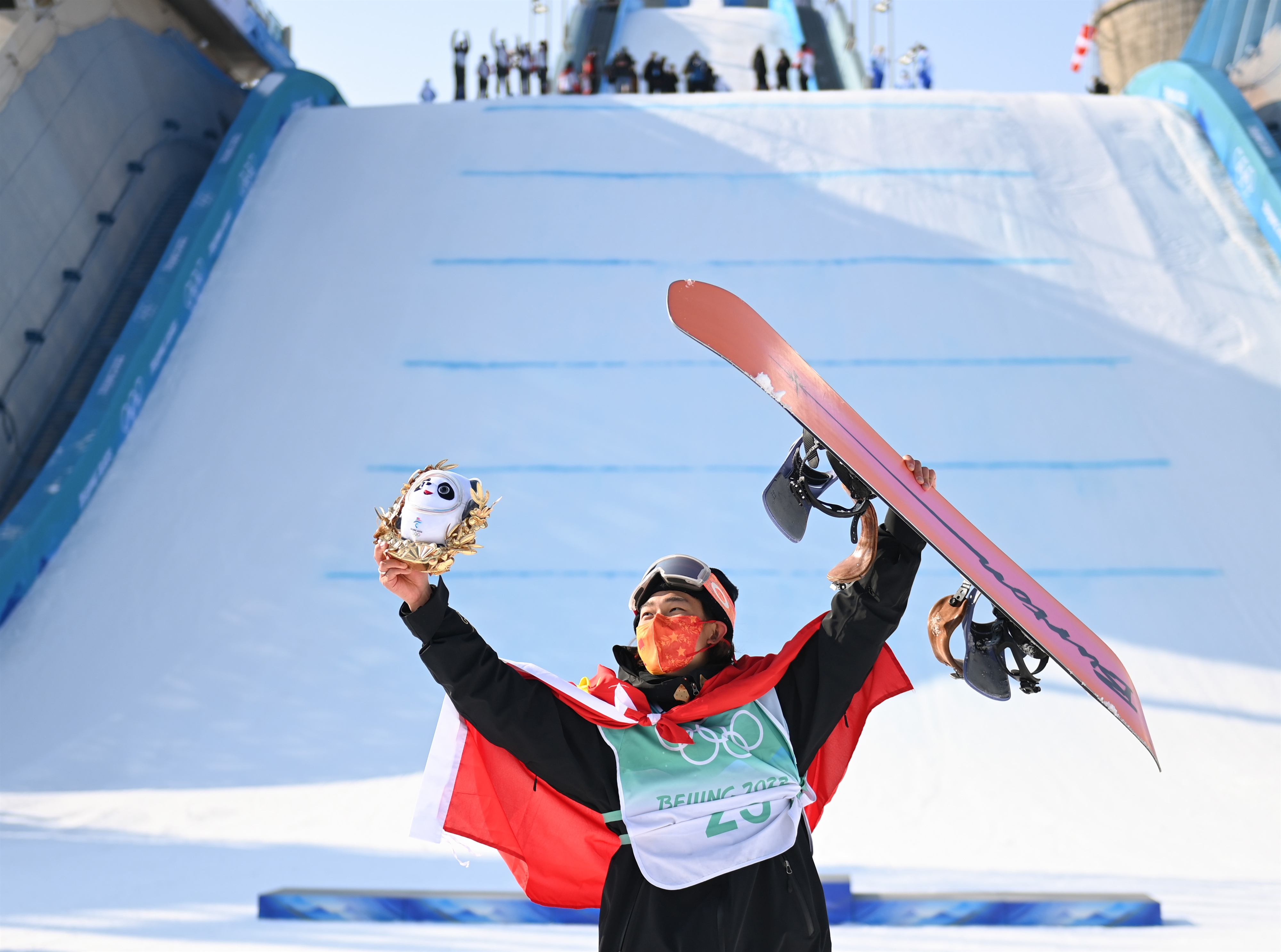 2月15日,苏翊鸣在北京冬奥会单板滑雪男子大跳台决赛夺冠后庆祝。新华社记者黄宗治摄