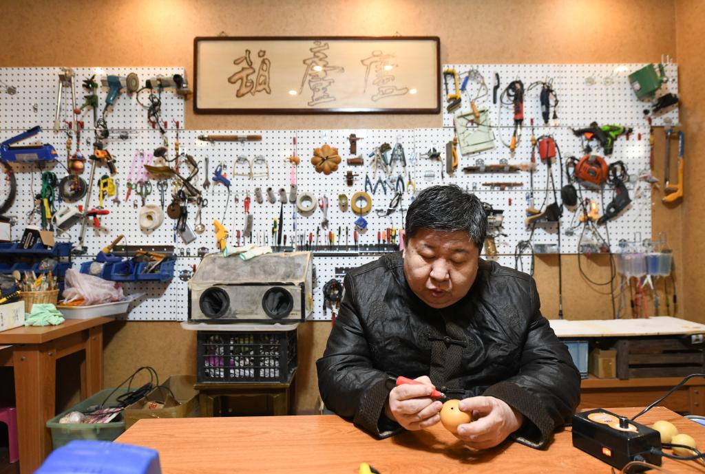 赵伟在工坊内进行葫芦烙画创作。 新华社记者 孙凡越 摄