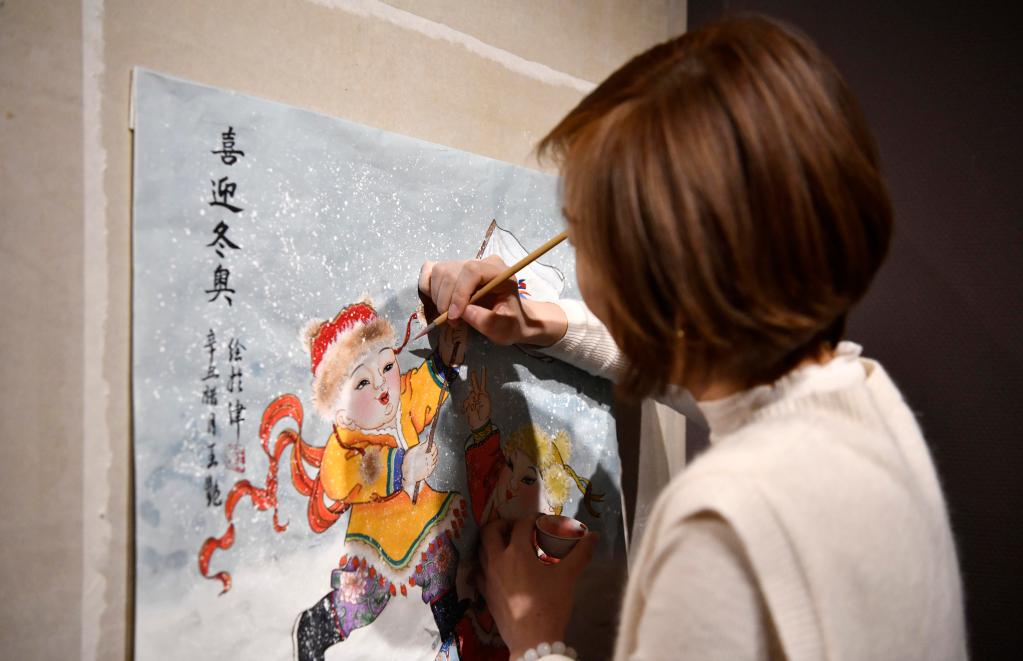 天津杨柳青画社的青年传承人团队成员在创作冬奥主题年画。 新华社记者 赵子硕 摄