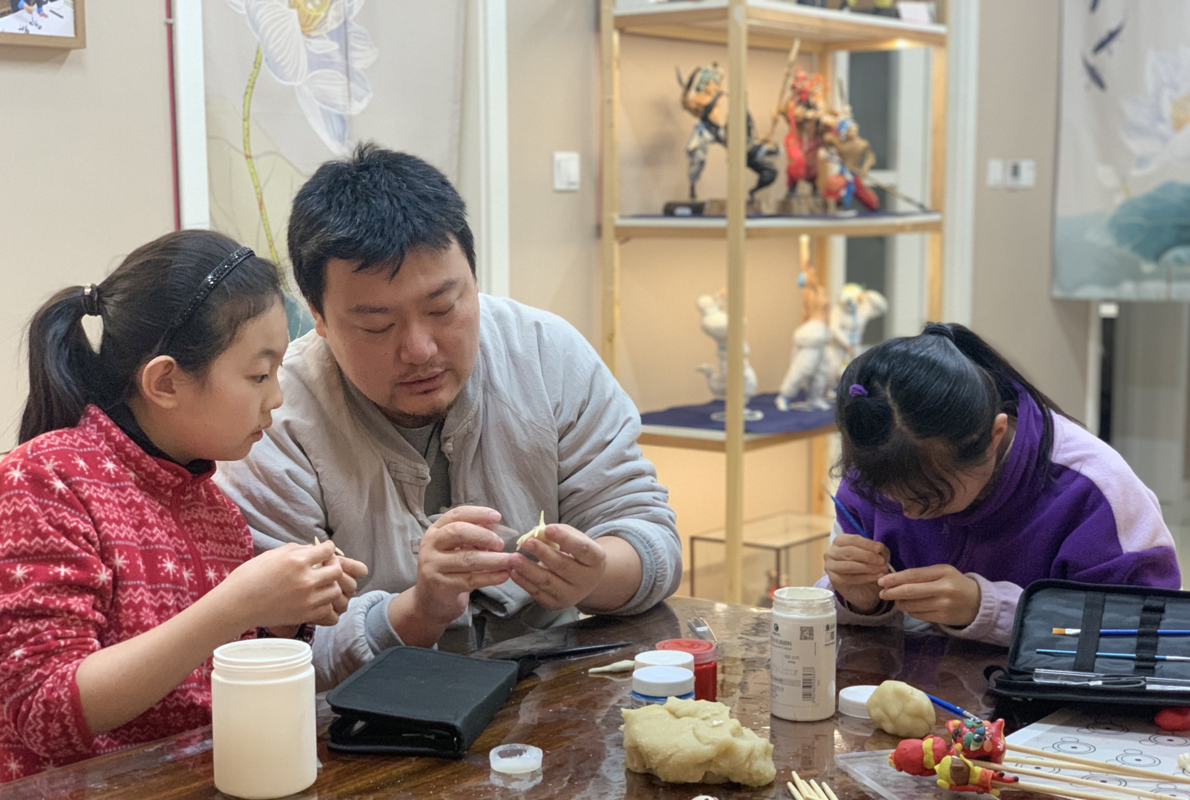 在创作之余,张倍源还开办了传习所,和多所中小学合作开设面塑课程。今年10岁的赵鹿笛跟随张倍源学习面塑已经有两年多时间,让她爱上面塑的除了亲手完成一件作品的成就感,还有张倍源讲故事式的上课方式:“张老师一边教技法,一边讲传统典故和民俗文化,上课不觉得无聊,还学习了很多知识。”在张倍源看来,只有把文化基础扎牢才能创作出好作品。