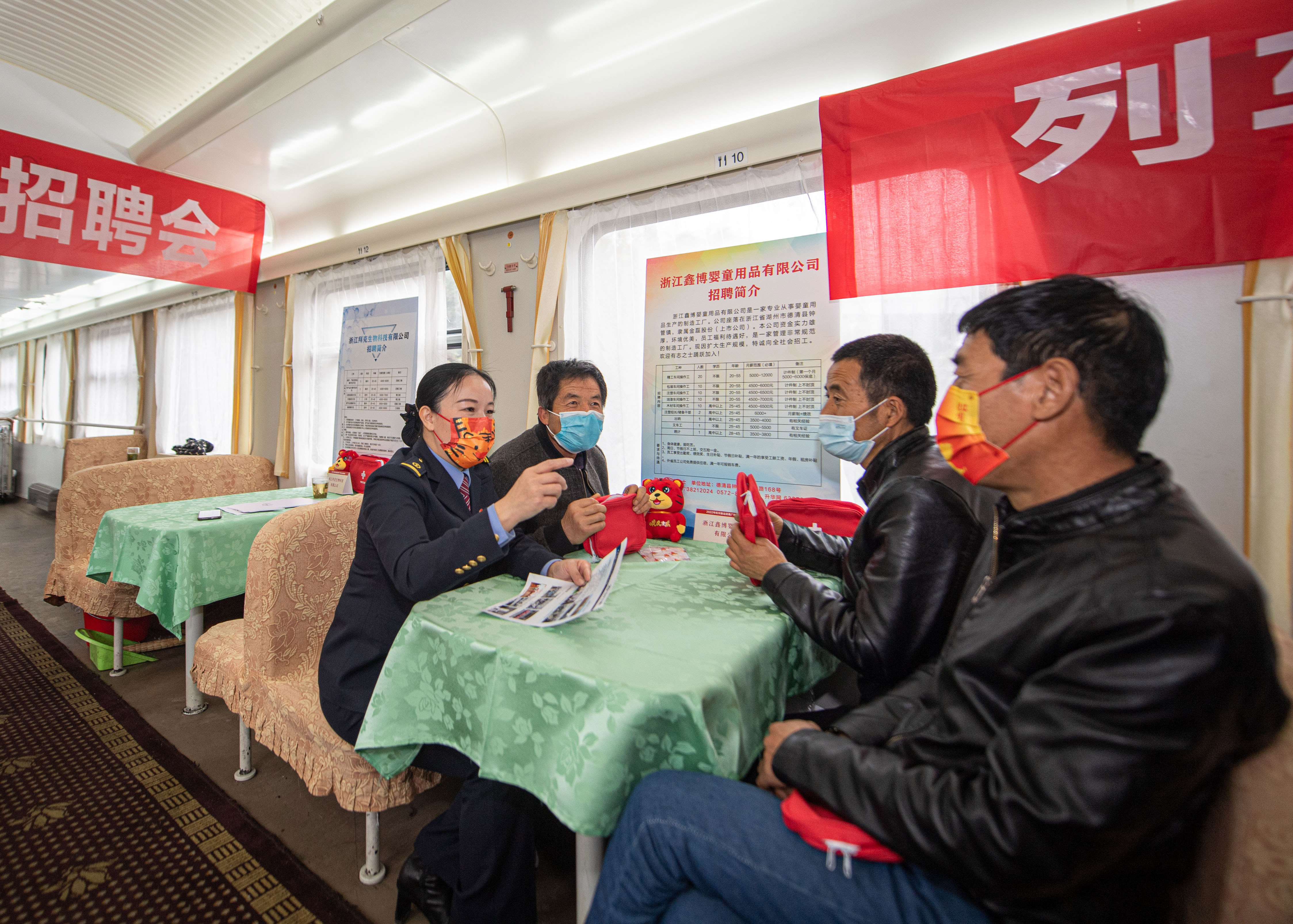 新华社照片,杭州,2022年2月18日 列车上的招聘会 2月18日,列车招聘会发起人陈美芳(左一)在餐车招聘接待处为旅客介绍招聘会的相关情况。 杭州客运段甬广车队的K210次列车途经广东、江西、浙江三省,每年春节后都有大量务工人员乘坐该次列车来浙求职。2月18日,浙江省总工会与杭州客运段在K210次列车上联合举办列车企业招聘会,来自浙江省9家企业的代表们在餐车车厢设立招聘接待处,并将招聘信息送到旅客手中,为乘坐该次列车的旅客提供就业服务。 新华社记者 江汉 摄