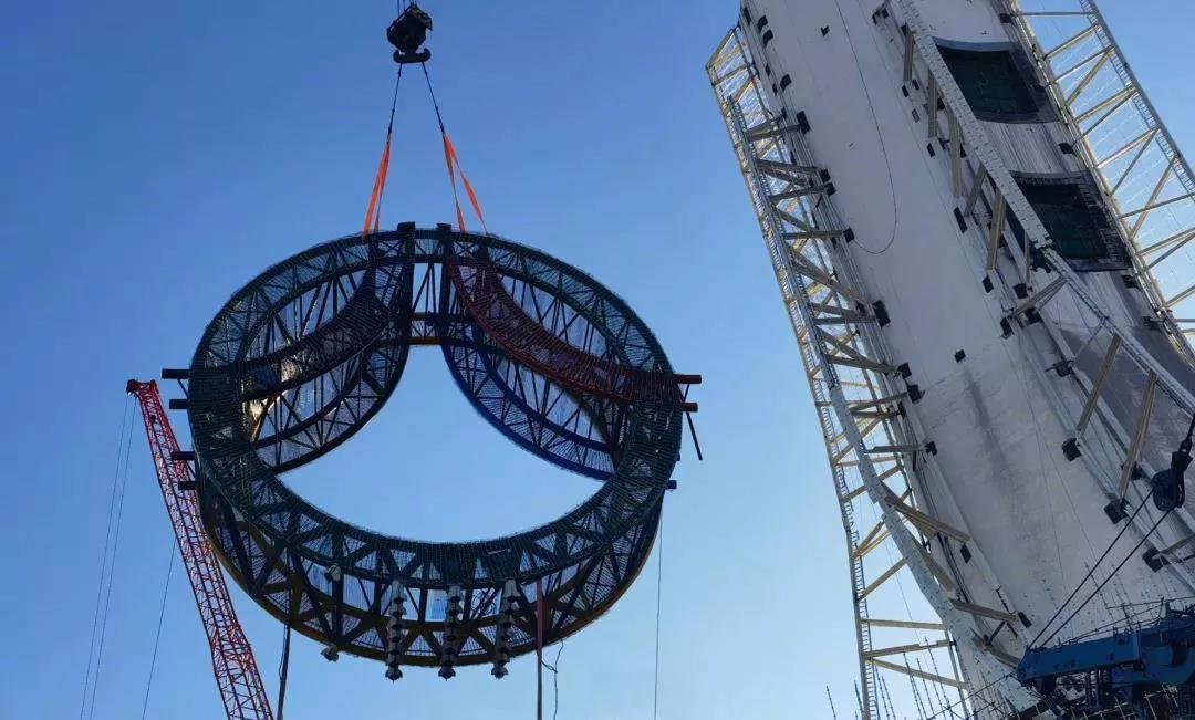 项目总工田磊介绍,经过多次商讨,最终的方案决定将奥运五环最下方黄、绿两环,以及蓝、黑、红三环各四分之一作一体化吊装,余下蓝、黑、红三环剩下的四分之三部分单独进行吊装焊接。