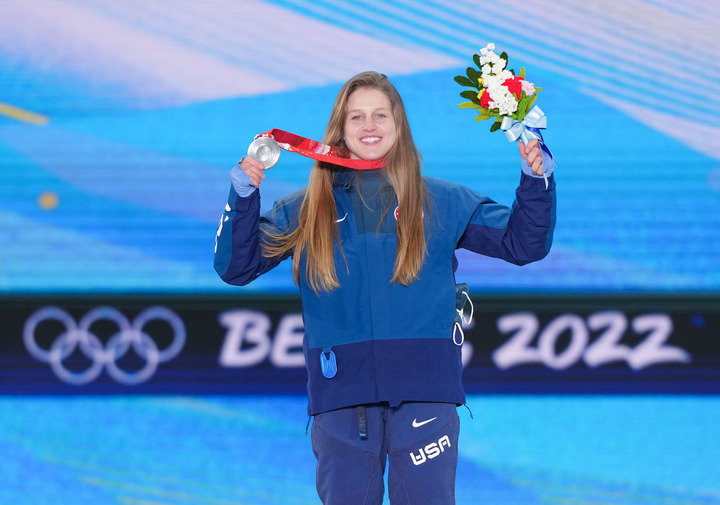 2月6日,亚军美国选手茱莉亚·马里诺在北京2022年冬奥会单板滑雪女子坡面障碍技巧奖牌颁发仪式上。新华社记者彭子洋摄