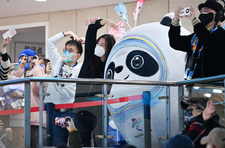 2月14日,吉祥物“冰墩墩”在北京2022年冬奥会女子冰球半决赛间隙和观众互动。新华社记者李然摄