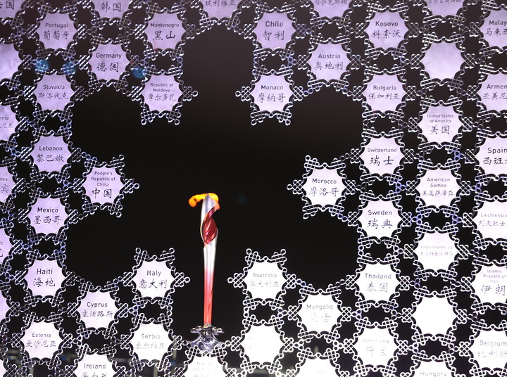 华灯初上,国家体育场璀璨夺目,宛若身披霓裳,在浩瀚夜空下熠熠生辉。“鸟巢”外,“大雪花”火炬上微火静静燃烧。