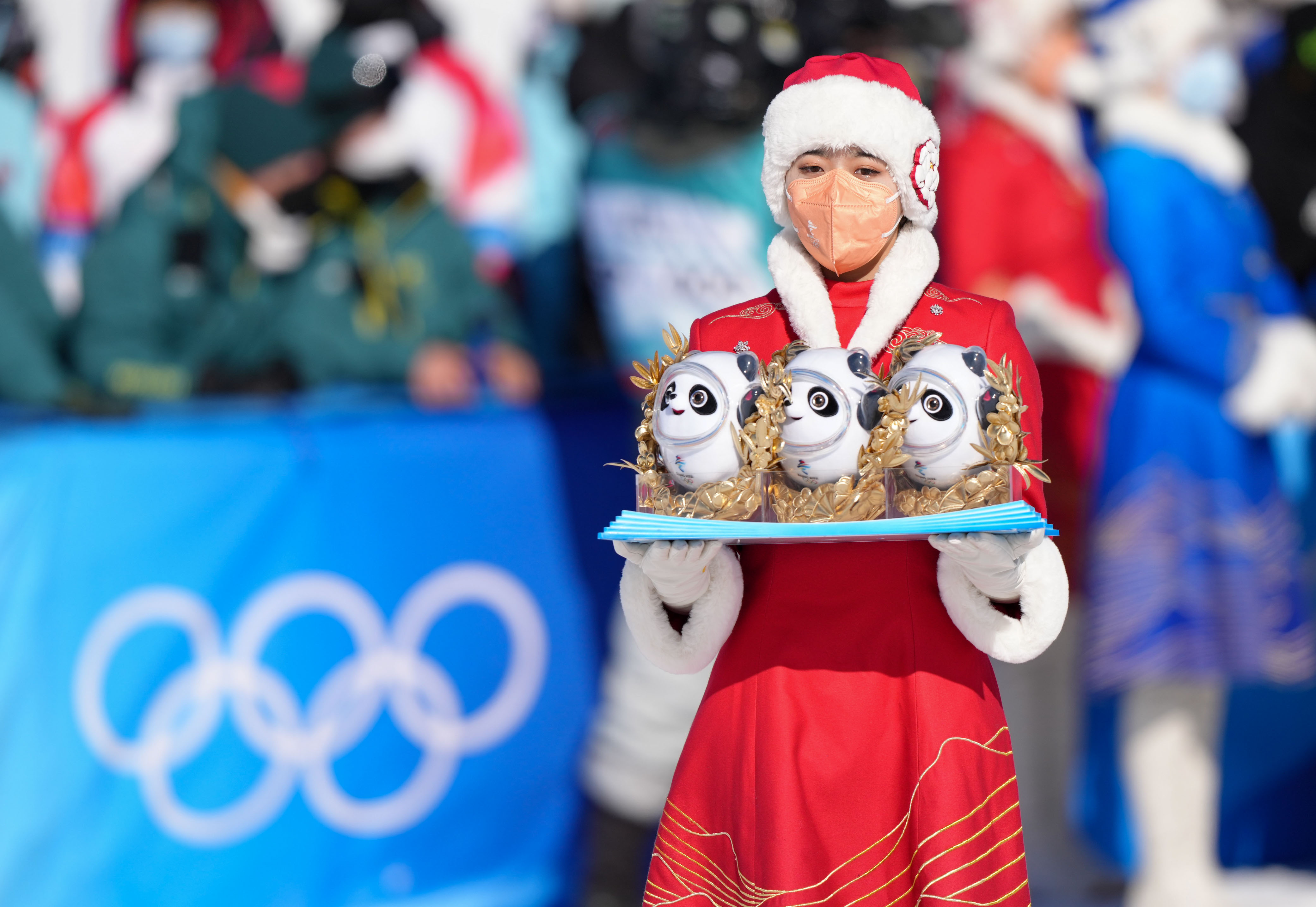 颁奖时刻,穿戴“瑞雪祥云”“鸿运山水”“唐花飞雪”服饰的礼仪人员托起宛如同心圆玉璧的冬奥奖牌,古老文明与奥林匹克于方寸间交相辉映。