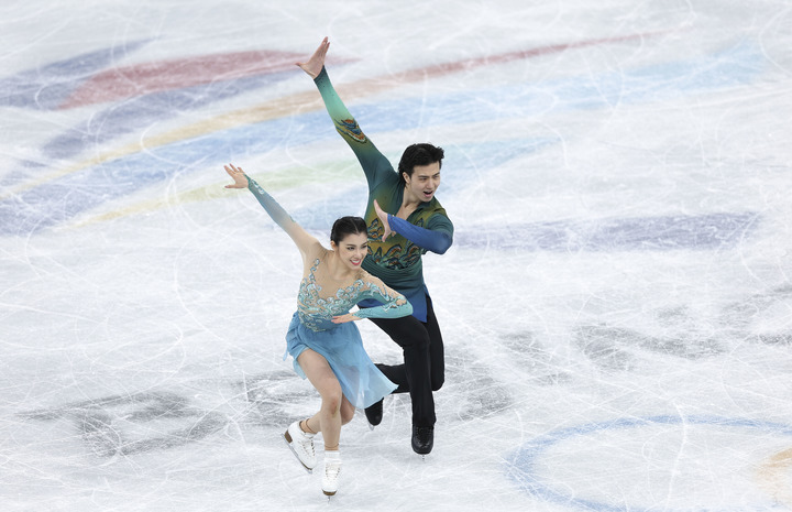 2月14日,中国选手王诗玥(左)和柳鑫宇在北京2022年冬奥会花样滑冰冰上舞蹈自由舞比赛中。新华社记者曹灿摄