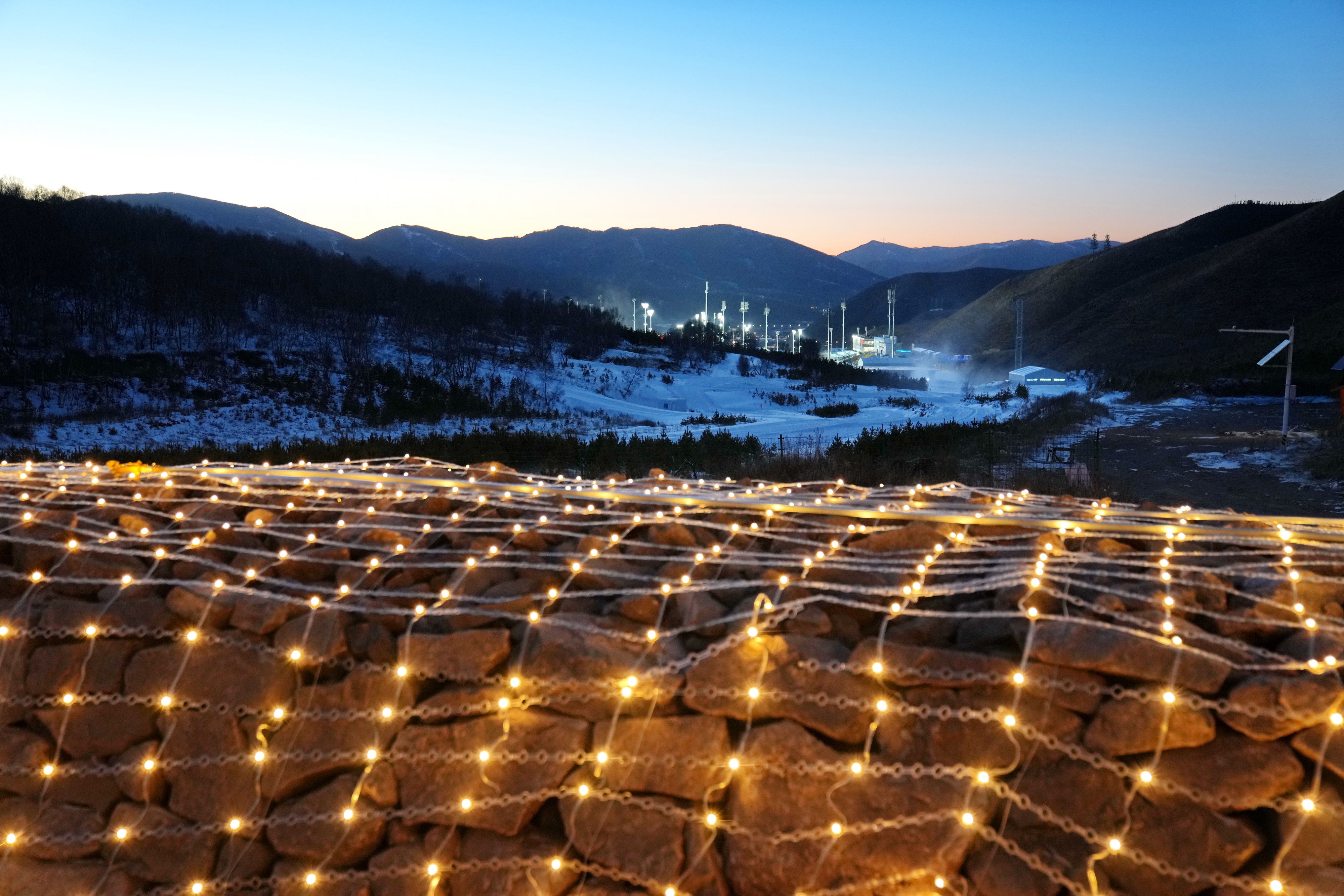 2021年12月30日,崇礼长城景观“点亮”冬奥梦,远处为国家越野滑雪中心(无人机照片)。新华社记者牟宇摄