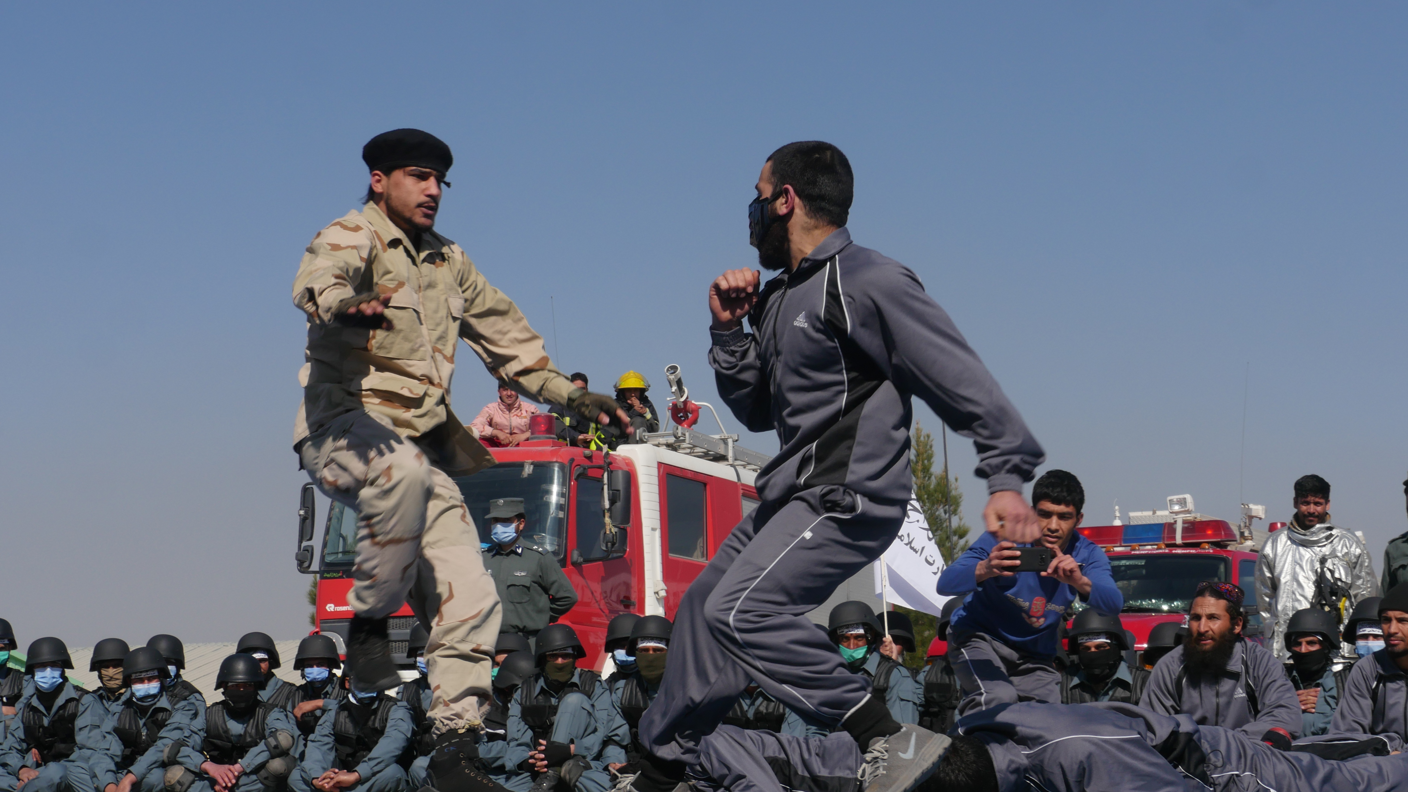新华社照片,赫拉特(阿富汗),2022年2月18日 (国际)(5)阿富汗:警校生毕业 2月17日,在阿富汗赫拉特省,警校学员在毕业典礼上进行表演。 当日,阿富汗赫拉特省警察学校的200多名学员完成训练,正式进入赫拉特省警察队伍。 新华社发(马沙勒摄)