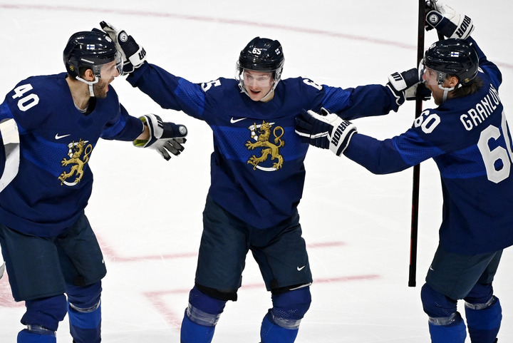2月18日,芬兰队球员萨卡里·曼尼宁(中)和队友在比赛中庆祝进球。新华社记者李紫恒摄
