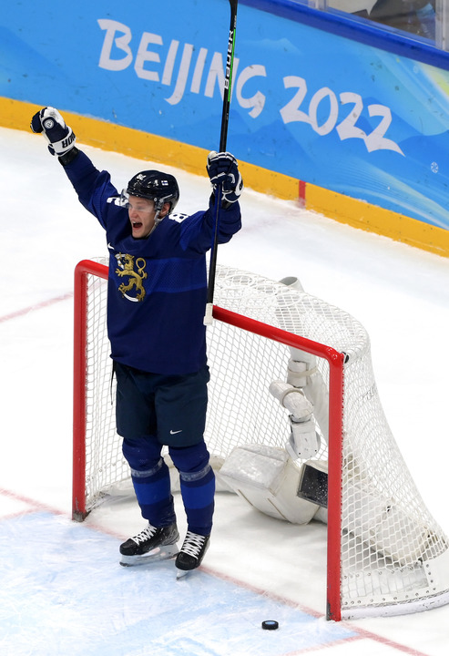 2月18日,芬兰队球员哈里·佩索宁在比赛中庆祝得分。新华社记者李安摄