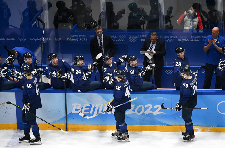 2月18日,芬兰队球员在北京冬奥会男子冰球半决赛中。新华社记者李紫恒摄