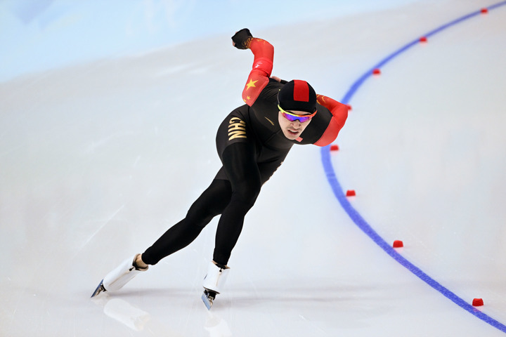 2月18日,中国选手宁忠岩在北京2022年冬奥会速度滑冰男子1000米决赛中。新华社记者程婷婷摄