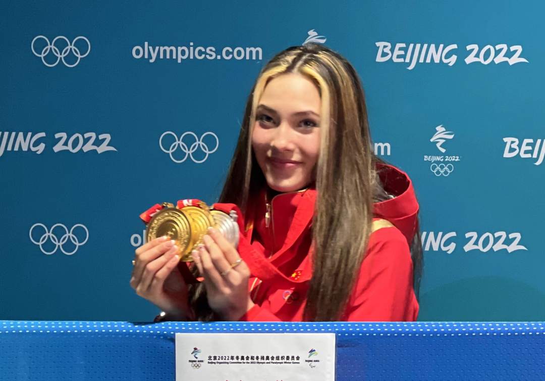 2月18日晚,自由式滑雪女子U型场地技巧颁奖仪式举行。谷爱凌戴上金牌,再次站上最高领奖台。至此,谷爱凌已经在本届冬奥会取得两金一银的成绩。