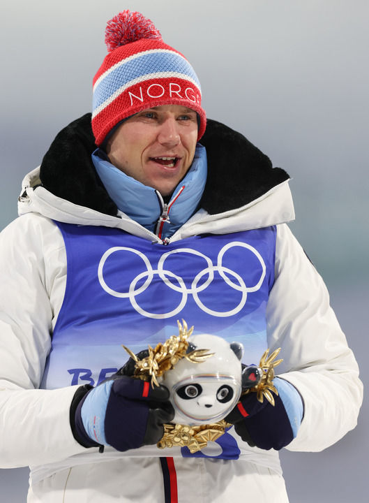 2月18日,季军挪威队选手韦特勒·肖斯塔·克里斯蒂安森在北京2022年冬奥会冬季两项男子15公里集体出发比赛后的颁发纪念品仪式上。新华社记者丁汀摄