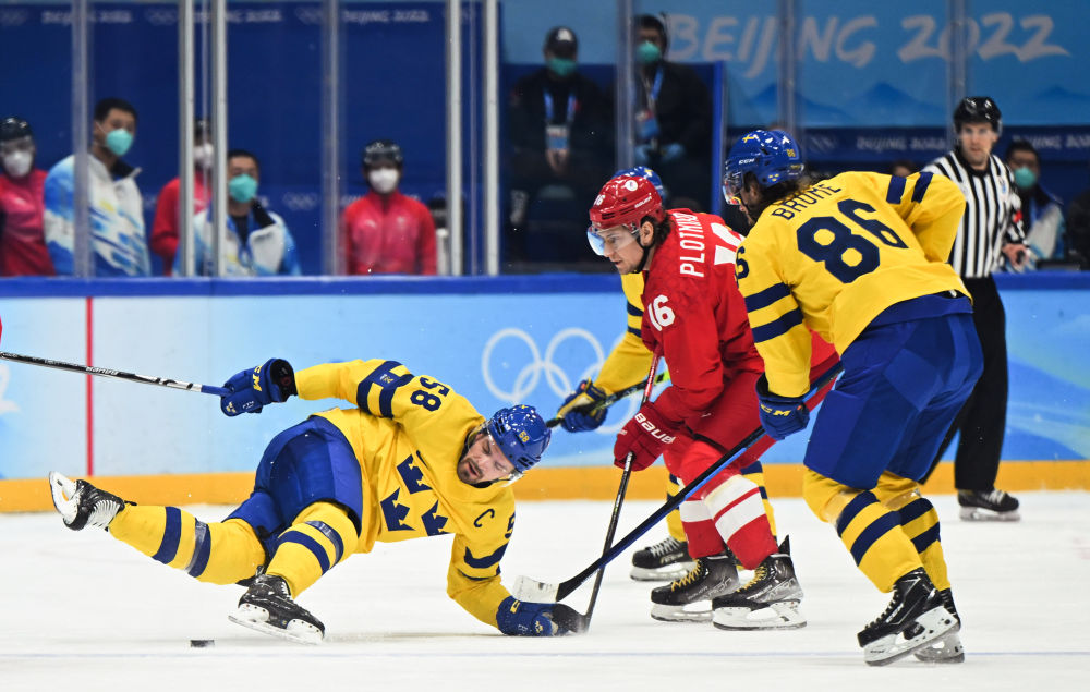 2月18日,瑞典队球员安东·兰德尔(左一)在北京冬奥会男子冰球比赛中。新华社记者李尕摄