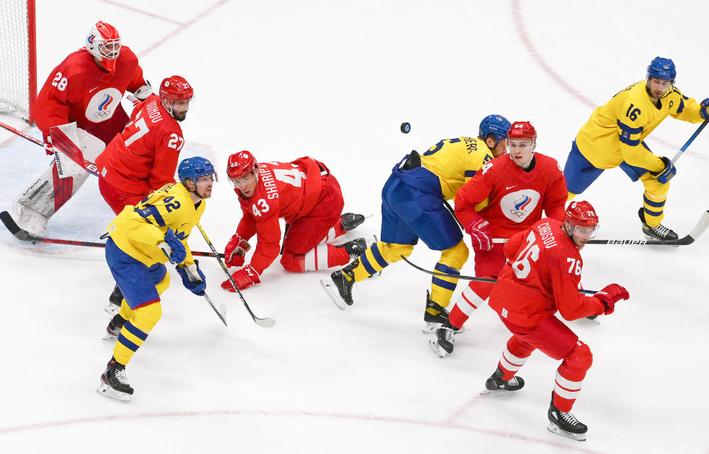 2月18日,北京冬奥会男子冰球半决赛中,俄罗斯奥委会队与瑞典队球员在门前拼抢。新华社记者刘潇摄