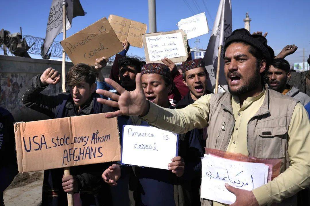 ▲ 2022年2月12日,阿富汗首都喀布尔爆发抗议活动,抗议者高举“美国偷走了阿富汗人民的钱”的标语,谴责拜登有关处置阿富汗被冻结资产的行政命令。
