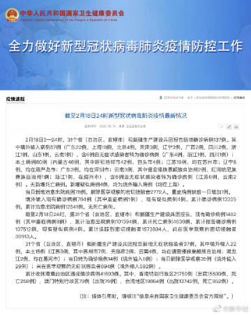截至2月18日24时,据31个省(自治区、直辖市)和新疆生产建设兵团报告,现有确诊病例1482例(其中重症病例8例),累计治愈出院病例101394例,累计死亡病例4636例,累计报告确诊病例107512例,现有疑似病例4例。累计追踪到密切接触者1573894人,尚在医学观察的密切接触者30913人。