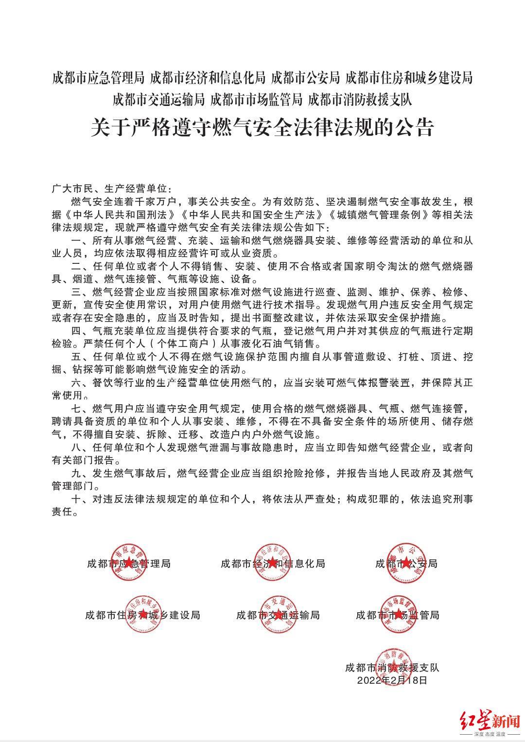 燃气安全连着千家万户 ,事关公共安全。2月18日,为有效防范、坚决遏制燃气安全事故发生,成都市应急管理局、成都市经济和信息化局、成都市公安局、成都市住房和城乡建设局、成都市交通运输局、成都市市场监管局、成都市消防救援支队7个部门联合发布《关于严格遵守燃气安全法律法规的公告》。