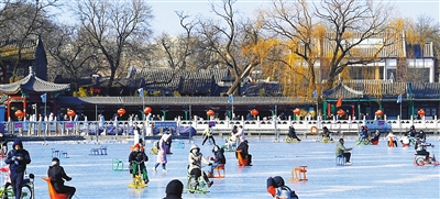 北京什刹海冰场开展了丰富多彩的冬奥文化展览和冰上主题文化活动,带动群众深入体验冰雪趣味运动。经济日报记者 陶天添摄