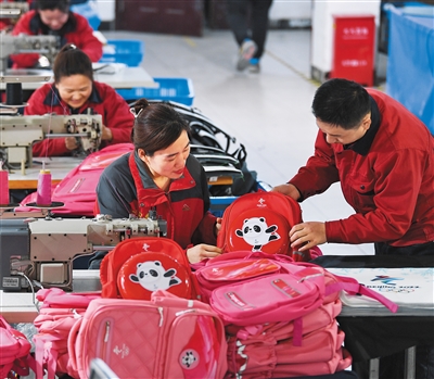 北京2022年冬奥会特许商品生产企业河北省广顺箱包工业有限责任公司车间里,员工在忙生产赶订单,确保供应。经济日报记者 赵 晶摄