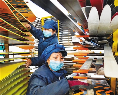 位于河北省张家口高新技术产业开发区内的京禧体育器材有限公司,员工在检查即将出厂的滑雪板。近年来,开发区依托园区建设,着力打造冰雪运动装备产业基地。经济日报记者 赵 晶摄