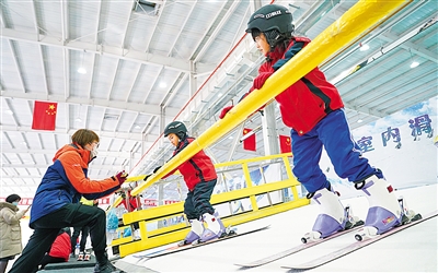 小朋友在河北省张家口冰雪运动装备产业园体验中心训练。目前,该产业园已初步实现轻重装备结合、研发制造销售全链条、运动体验会展全覆盖的冰雪运动装备产业布局。经济日报记者 赵 晶摄