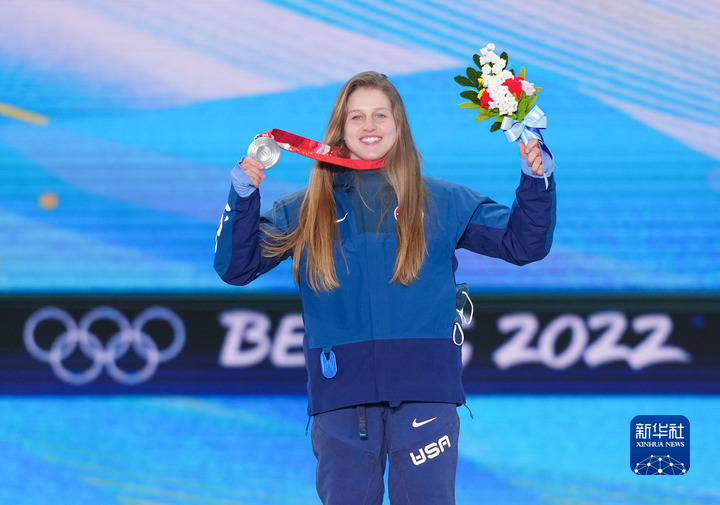 2月6日,亚军美国选手茱莉亚·马里诺在北京2022年冬奥会单板滑雪女子坡面障碍技巧奖牌颁发仪式上。新华社记者彭子洋摄