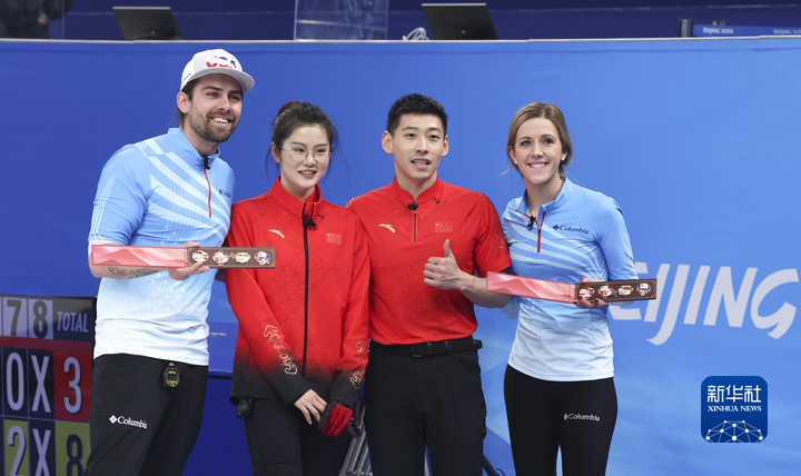 2月5日,中国队选手范苏圆(左二)、凌智(左三)与美国队选手克里斯托弗·普利斯(左一)、维姬·佩辛格在北京2022年冬奥会冰壶混双循环赛比赛后合影。新华社记者王婧嫱摄