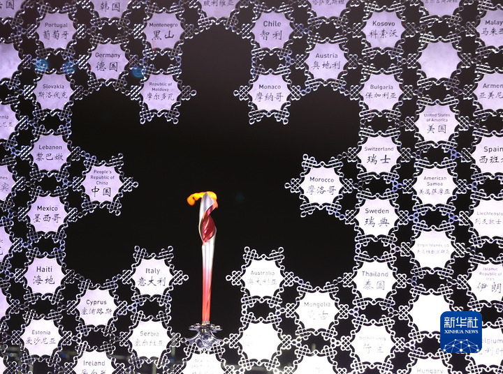 华灯初上,国家体育场璀璨夺目,宛若身披霓裳,在浩瀚夜空下熠熠生辉。“鸟巢”外,“大雪花”火炬上微火静静燃烧。