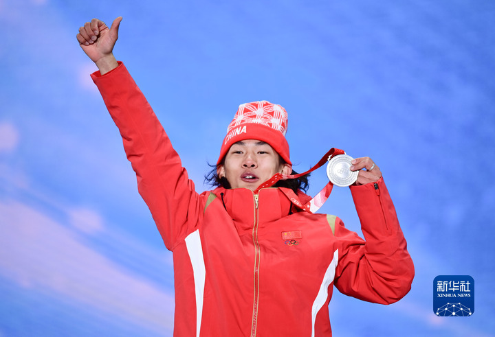 2月7日,亚军中国选手苏翊鸣在北京2022年冬奥会单板滑雪男子坡面障碍技巧奖牌颁发仪式上。新华社记者张宏祥摄