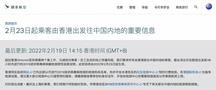2月19日,国泰航空官网发布旅游提示:因应香港奥密克戎(Omicron)变异毒株个案上升,为减低对乘客、员工及目的地之传播风险,我们要求所有由香港前往中国内地的乘客,都必须出示在航班出发前48小时内进行的新冠病毒核酸检测阴性结果证明。此安排将由2022年2月23日起生效。