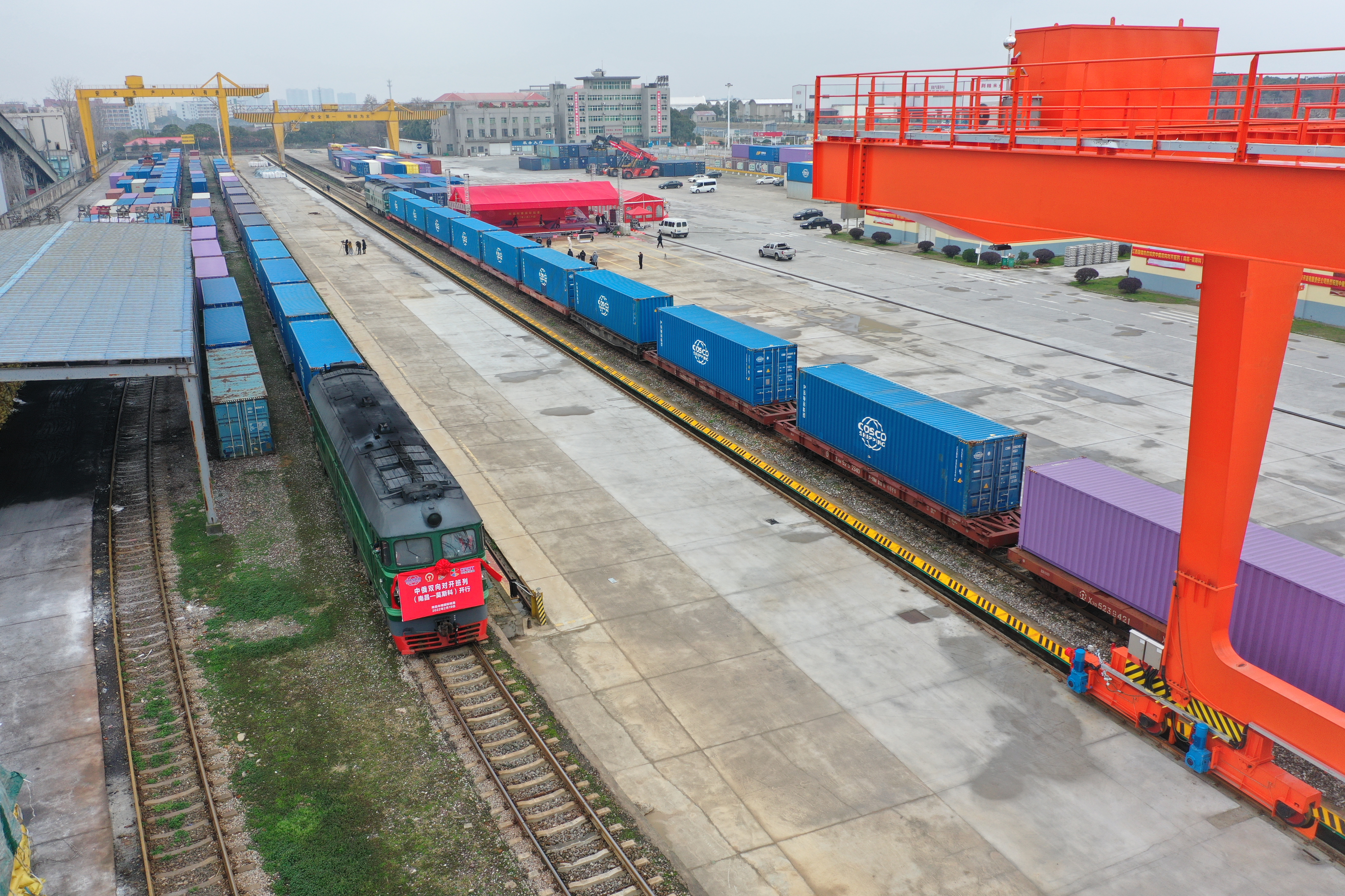 新华社照片,南昌,2022年2月19日 2022年江西首列中俄双向对开班列(南昌-莫斯科)成功实现往返对发 2月19日在南昌向塘国际陆港拍摄的中俄双向对开班列,左为准备从南昌开往莫斯科的班列,右为由莫斯科出发抵达南昌的班列(无人机照片)。 当日,由中远海运承运的2022年江西省首列中俄双向对开班列(南昌-莫斯科)在南昌向塘国际陆港成功实现往返对发。去程班列上满载胶带、汽车配件、布匹、鞋子等货物,抵达南昌的回程班列满载41车纸品。此趟“对开班列”的开行,将提高集装箱周转效率,降低企业运输成本,为我国与俄罗斯及周边国家的经贸往来搭建起双向“快车道”。 新华社记者 彭昭之 摄