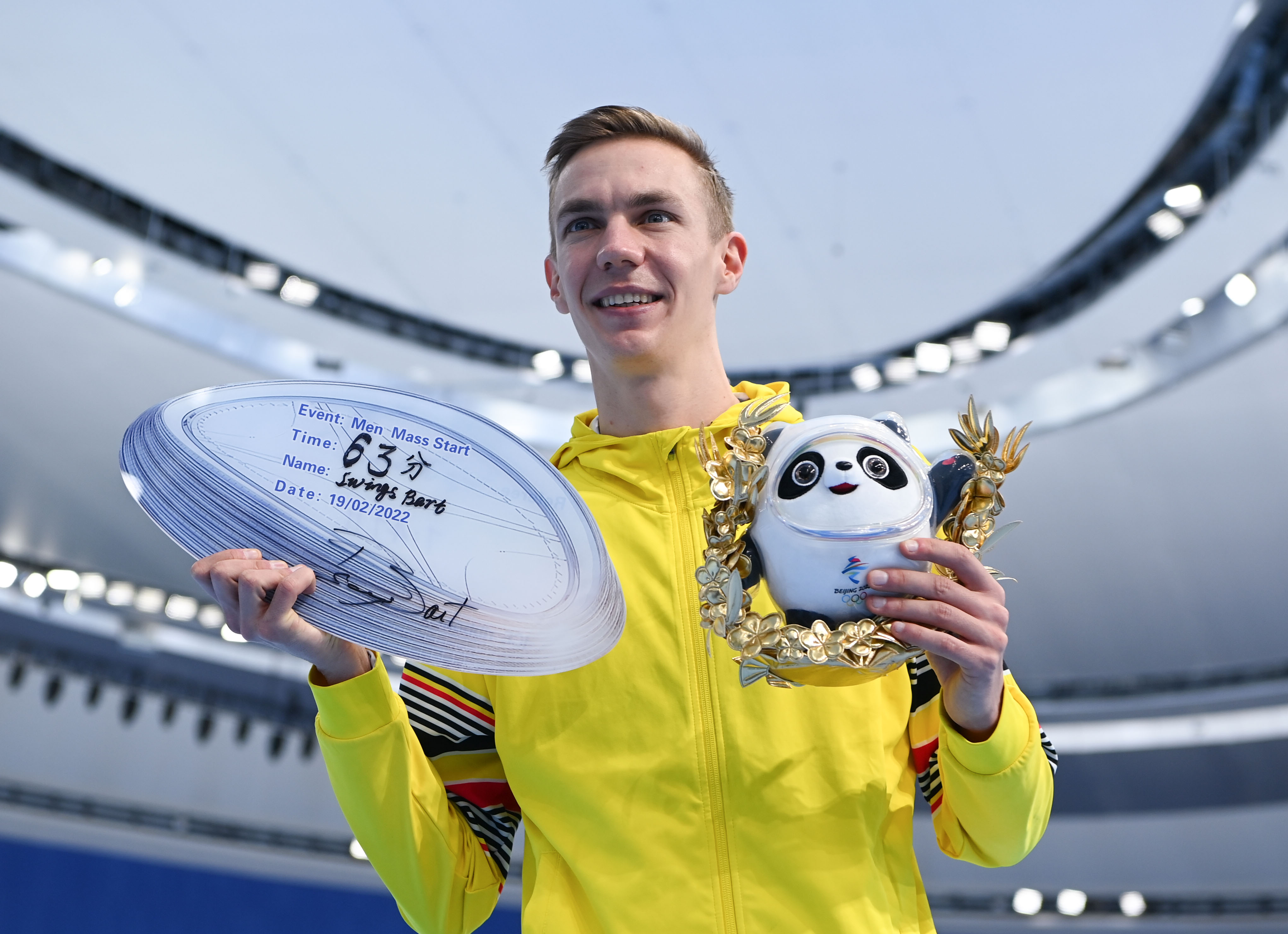 2月19日,比利时选手巴·斯温斯在颁发纪念品仪式上。新华社记者武巍摄