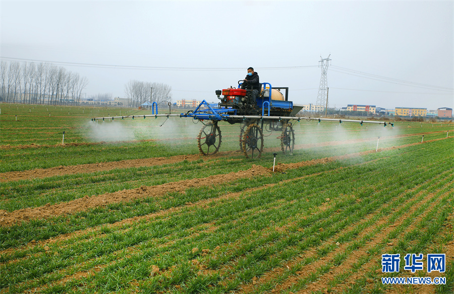 2022年2月17日,河南省开封市尉氏县庄头镇,农业技术人员正在用大型农机设备为小麦喷施叶面肥。