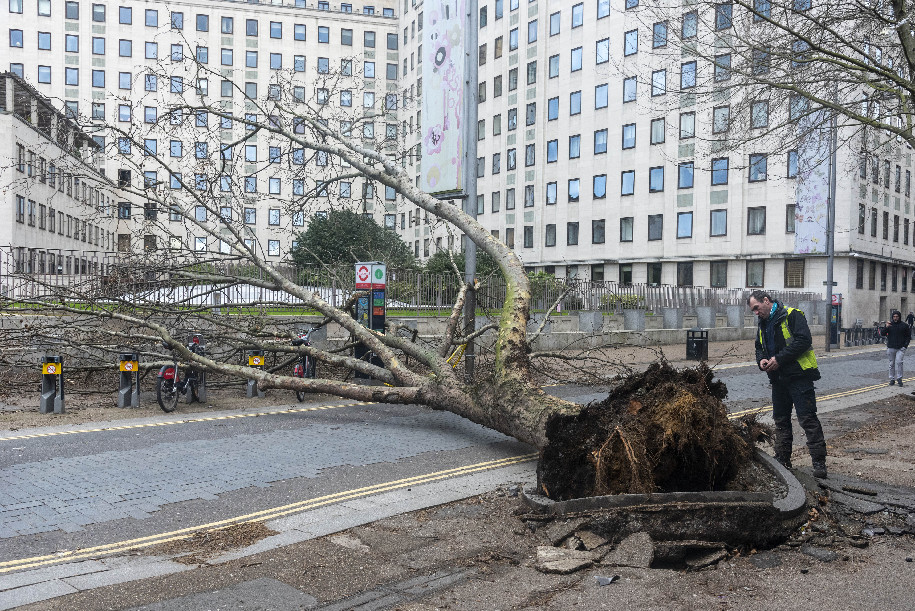 ↑2月18日,英国伦敦的一棵大树被吹倒在地。新华社发(雷伊·唐摄)