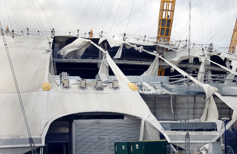↑2月18日,英国伦敦O2体育馆顶部织物被狂风撕开,致使体育馆部分内部结构外露。新华社记者 李颖 摄